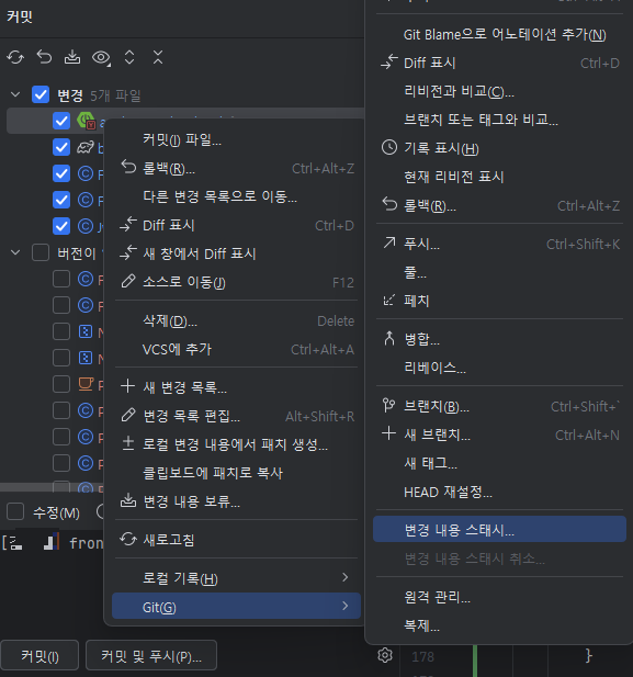 - 상단 메뉴에서 Git > Stash Changes... 를 선택합니다.