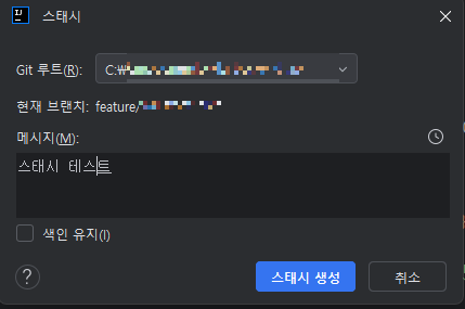 3) 메시지 입력: Stash에 저장할 때 사용할 메시지를 입력하고 Stash 버튼을 클릭하시면 됩니다.
