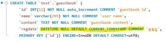 - `regdate` DATETIME NULL DEFAULT NULL COMMENT '등록일', 이걸 자동으로